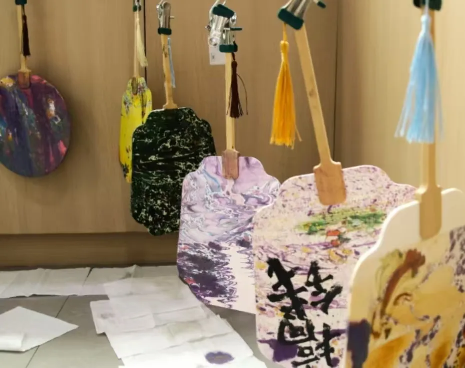 在漆扇制作环节中,同学们拿着提前备好的扇子底模,调制好漆料,开始了独特的创作之旅,发挥着天马行空的想象,精心勾勒奇幻场景。