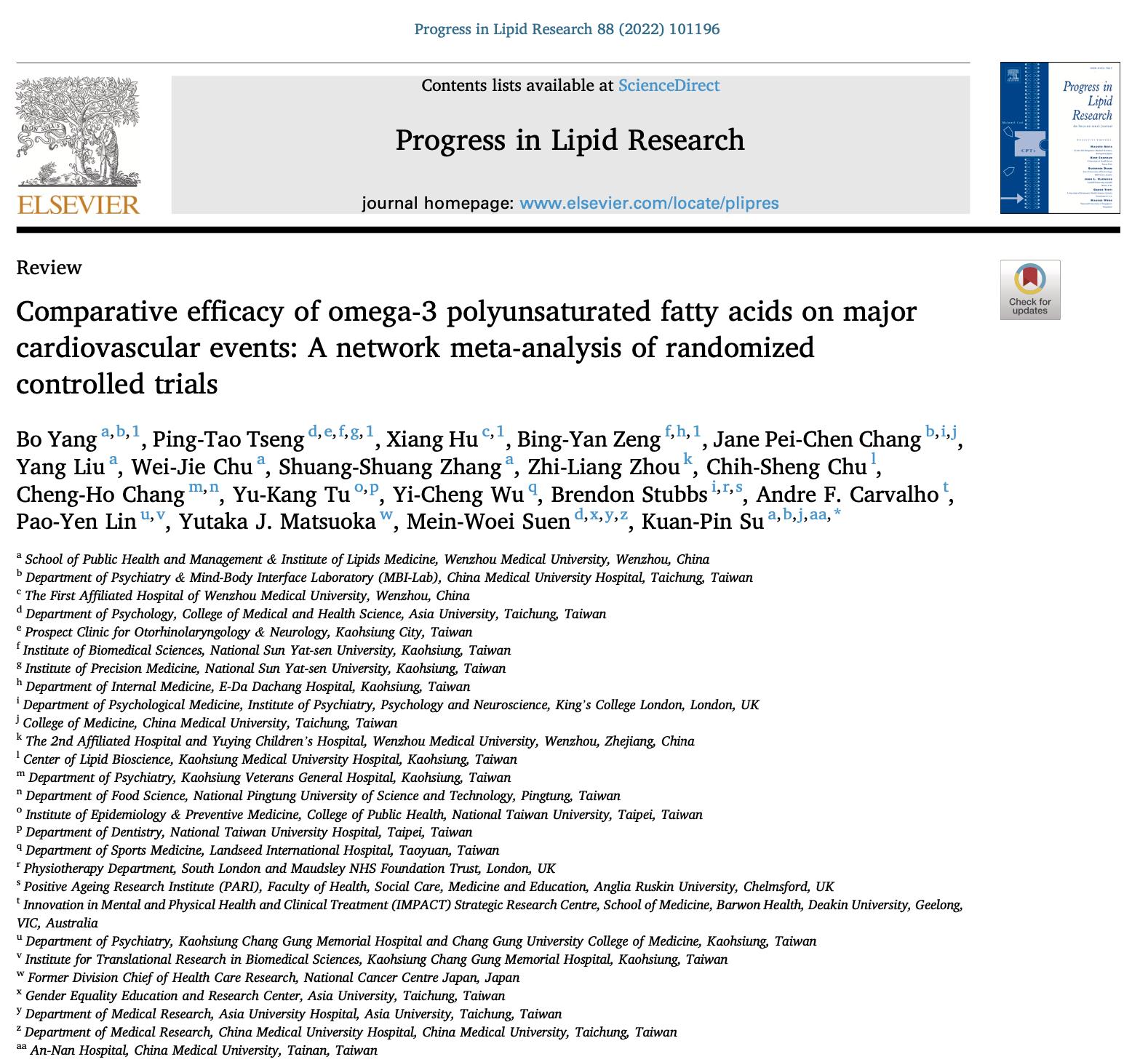 针对这个重大健康议题,我校公共卫生与管理学院杨波校聘研究员团队,联合台湾中国医药大学身心介面研究中心研究团队和多名国际脂质研究学者,在国际脂质医学顶级期刊《PROG LIPID RES》(5-year IF=17.40)发表题为“Comparative efficacy of omega-3 polyunsaturated fatty acids on major cardiovascular events: A network meta-analysis of randomized controlled trials”学术论文,校公共卫生与管理学院为第一作者和通讯作者第一单位:公共卫生与管理学院杨波研究员为第一作者,亚洲大学神经科诊所曾秉涛医师和附属第一医院内分泌科胡珦副主任医师为共同第一作者,国际知名营养医学专家、台湾中国医药大学身心介面研究中心主任、91视频 脂类医学研究所外方所长苏冠宾教授为独立通讯作者。