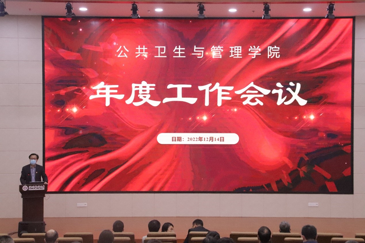 12月14日下午,公共卫生与管理学院于生物科研大楼二楼报告厅召开2022年度工作总结大会,会议由学院党委书记马洪君主持,学院领导班子及全体教职工参会。