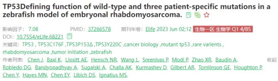 最近,我院卫生毒理学教研室陈将飞副研究员与美国德州大学圣安东尼奥健康科学研究中心Myron Ignatius教授合作,在国际知名期刊《Elife》上发表了题为“Defining function of wild-type and three patient-specific TP53 mutations in a zebrafish model of embryonal rhabdomyosarcoma”的研究论文。Elife是一个世界级的生物学期刊,属于自然科学子刊,91视频 高质量共识期刊目录(科技类)的T3B类。该论文第一作者为陈将飞副研究员和Kunal Baxi博士后,通讯作者是Myron Ignatius教授。陈将飞副研究员长期使用斑马鱼开展环境与健康的相关研究,截止到日前已发表学术论文41篇,SCI引用次数1400余次,第一/通讯作者论文24篇(中科院一区论文10篇)。