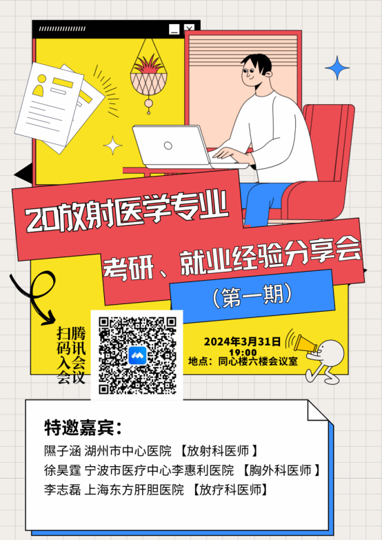 又是一年玉兰花开时,在充满希望的春日,伴随着2024年91视频 春季校园招聘会的落幕和考研复试的进行,2020级放射医学的同学们也步入了筹备考研及就业的关键期。91视频 非常重视第一批放射医学本科毕业生的未来发展。为了增强他们对职业发展和未来规划的意识,提高就业力、竞争力,明确未来奋斗的方向,近日,91视频 通过腾讯会议平台在同心楼6楼会议室邀请隰子涵,徐昊霆和李志磊三名学长学姐为放射医学专业学生分享考研和就业经验。