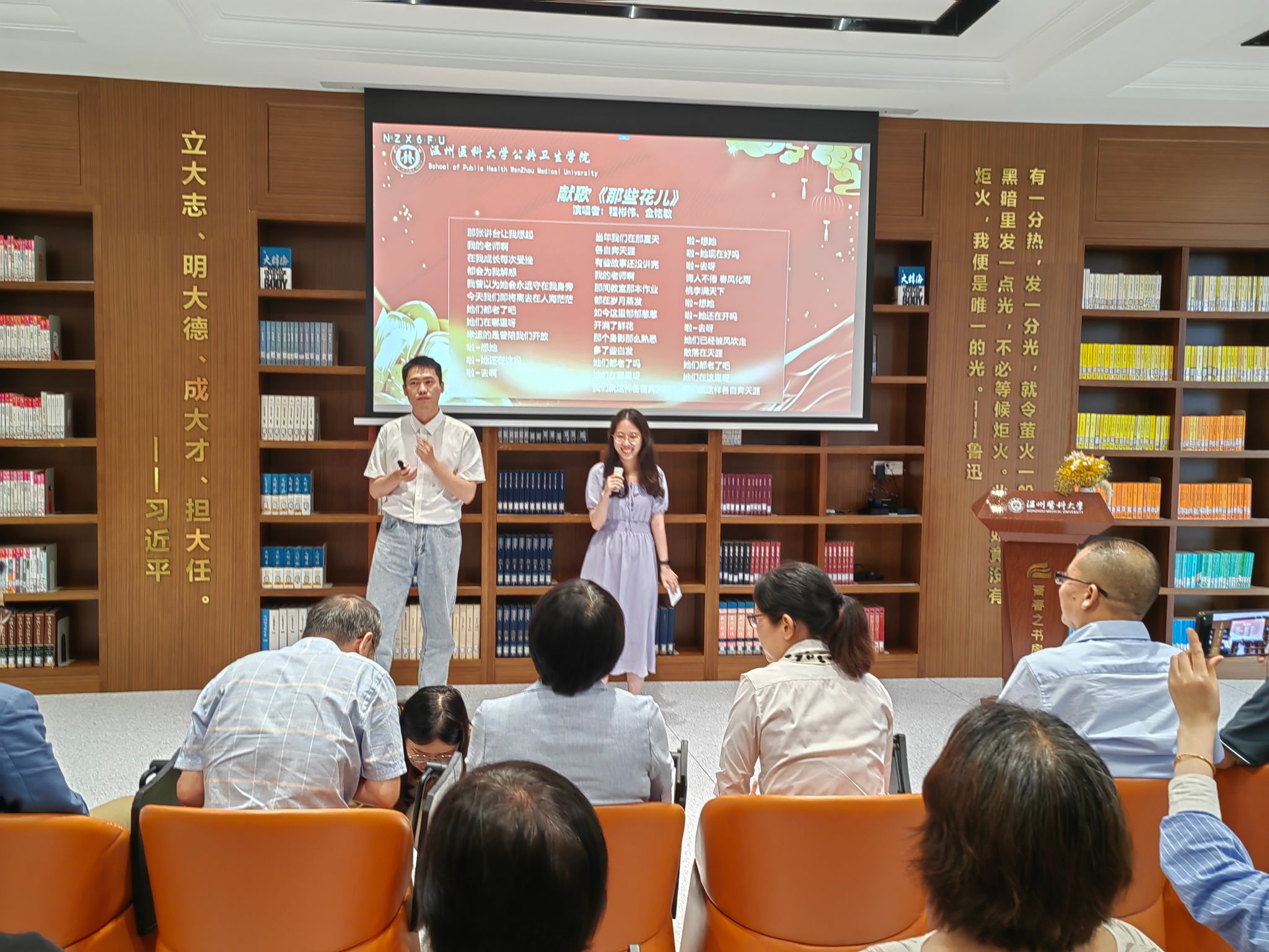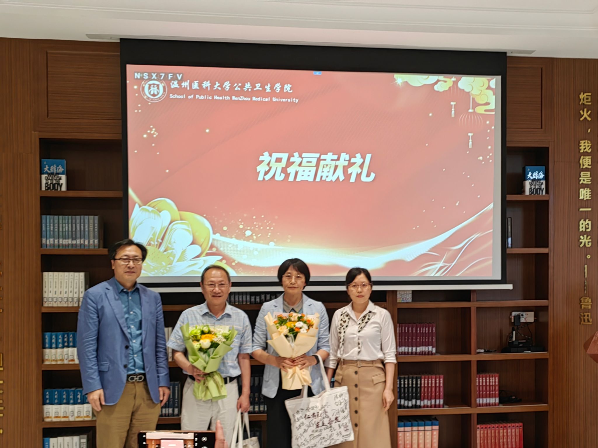 宣读了褒奖辞之后,院长刘晓冬、党委书记王芳,代表学院为两位荣休教授夫妇献上鲜花,以及承载了公卫师生签名寄语、满满心意的温医大纪念帆布包,感谢两位教授多年来为学院学科建设、教学、科研等方面做出的贡献。