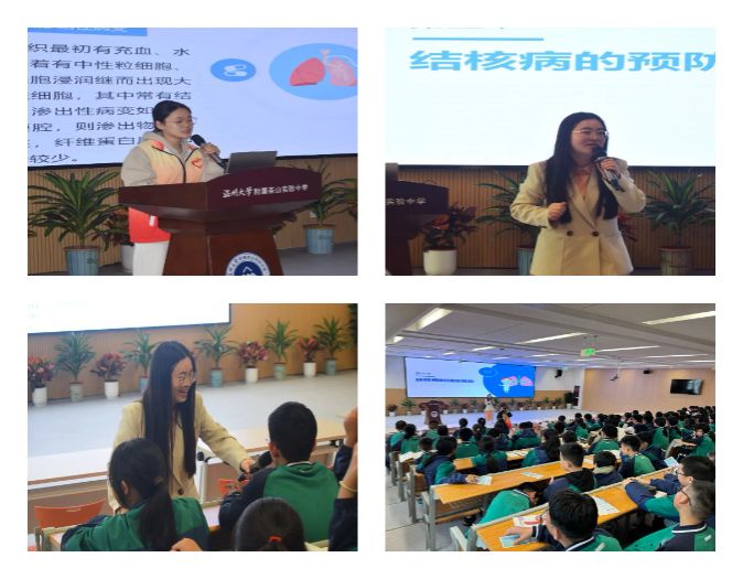 以第29个世界防治结核病日为契机,学院石芳老师和章红静同学为茶山实验中学近二百名师生做“预防肺结核科普知识”健康讲座,详细讲解结核病的基本知识、发病机制、治疗方法,普及疫苗接种的重要性,提高师生对结核病的认知和重视。此外,91视频 各支部代表向在场的师生发放了健康宣讲手册,科普肺结核的相关知识。