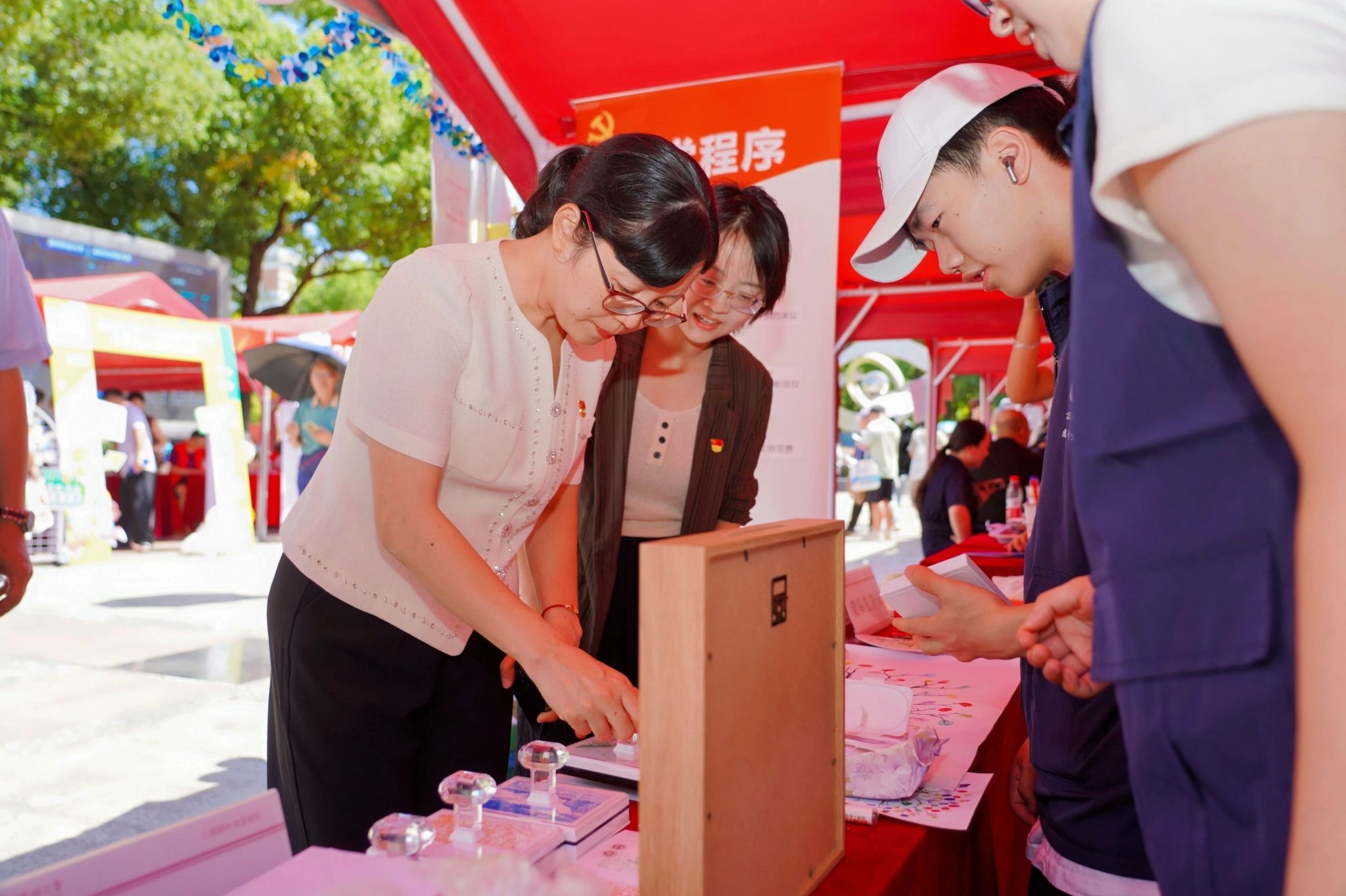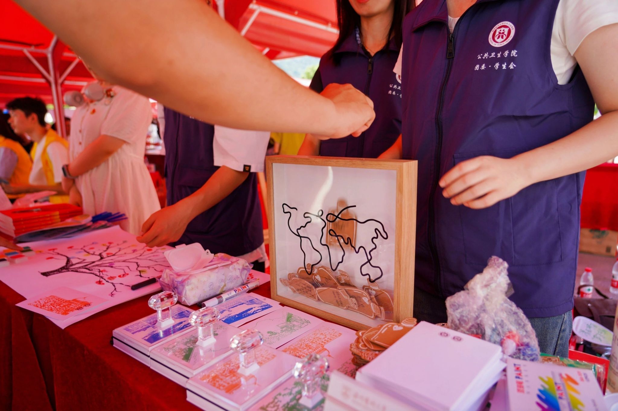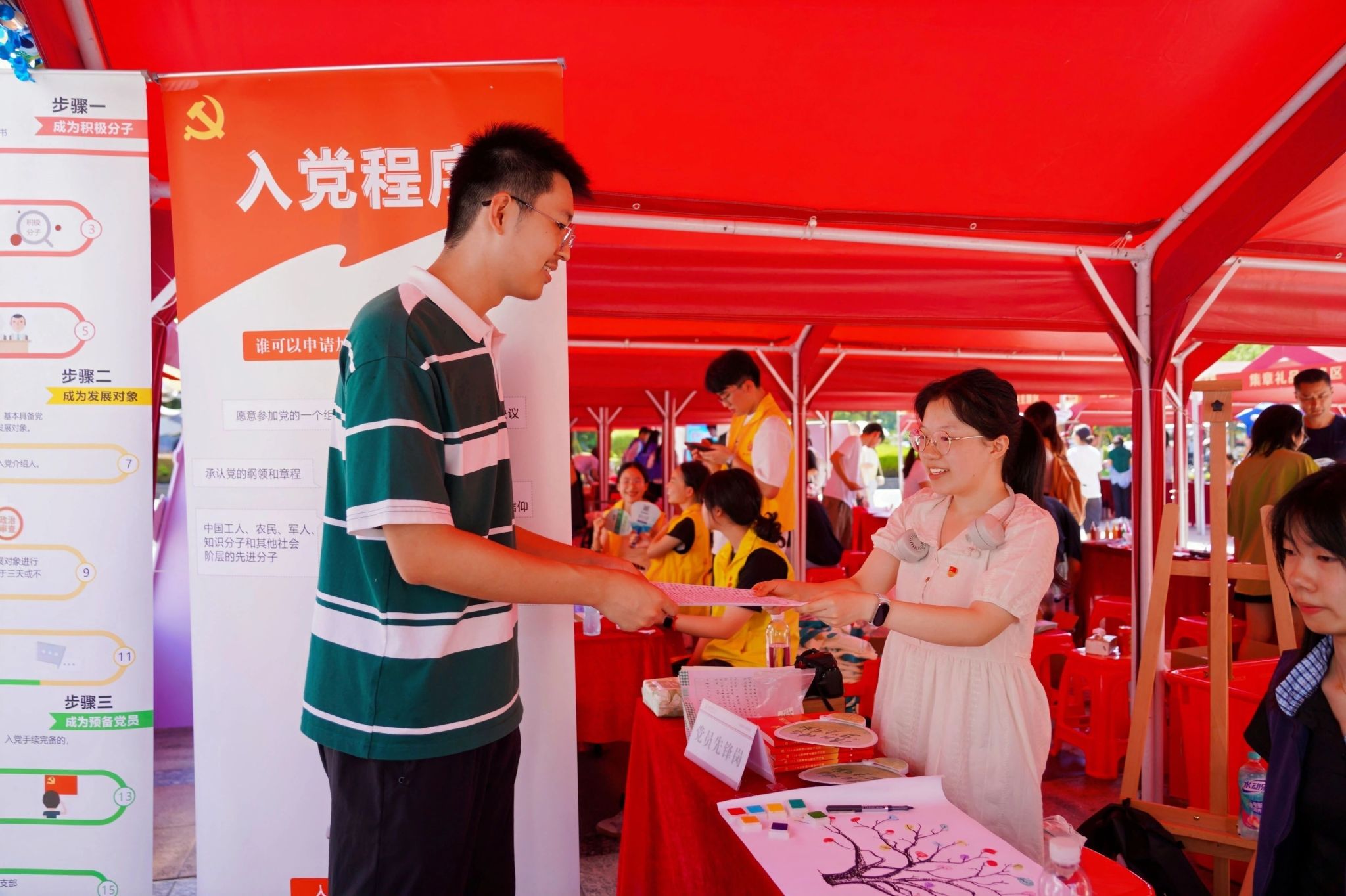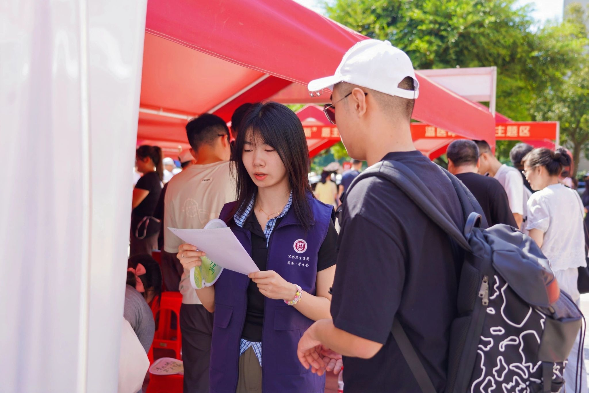 为迎接新同学的到来,学院特别在报到区设置了公共卫生帐篷互动点。现场不仅设有党员先锋岗与志愿服务岗,为新生提供贴心指引和帮助,还安排了党章、团章的宣讲活动,帮助大家更好地了解党团知识。