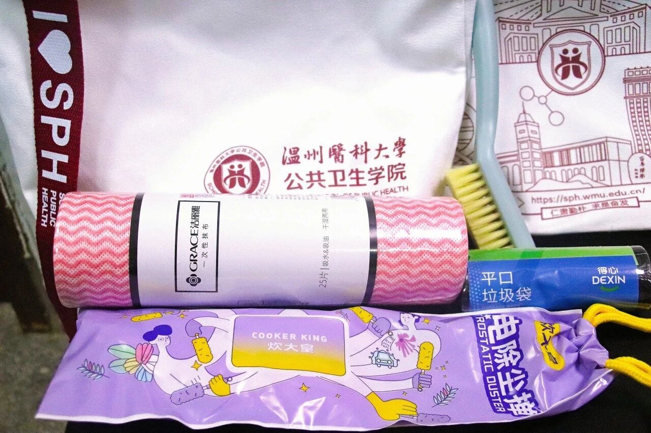 文明寝室建设礼包配有抹布、刷子、垃圾袋和除尘掸,助力同学们打造整洁舒适的宿舍环境,从一方小小天地出发,共建文明校园。